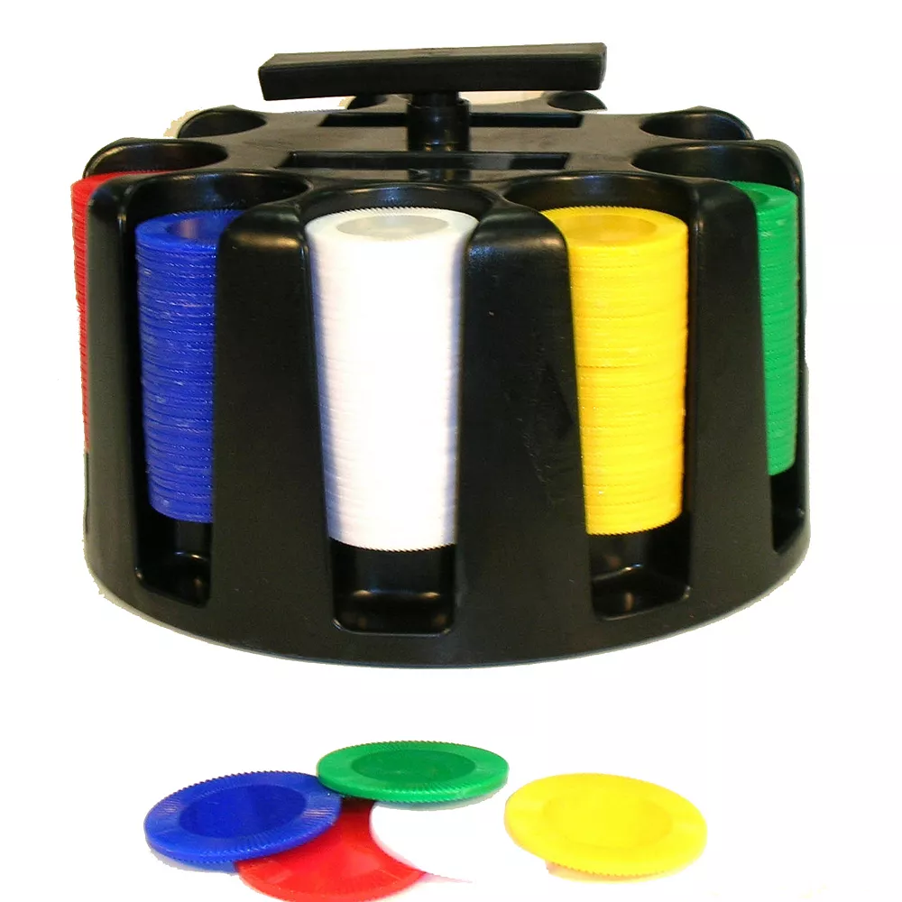 Assorted colored chips and a handy revolving tray make playing poker easy and fun with this 300 Chip set by John N. Hansen Co..