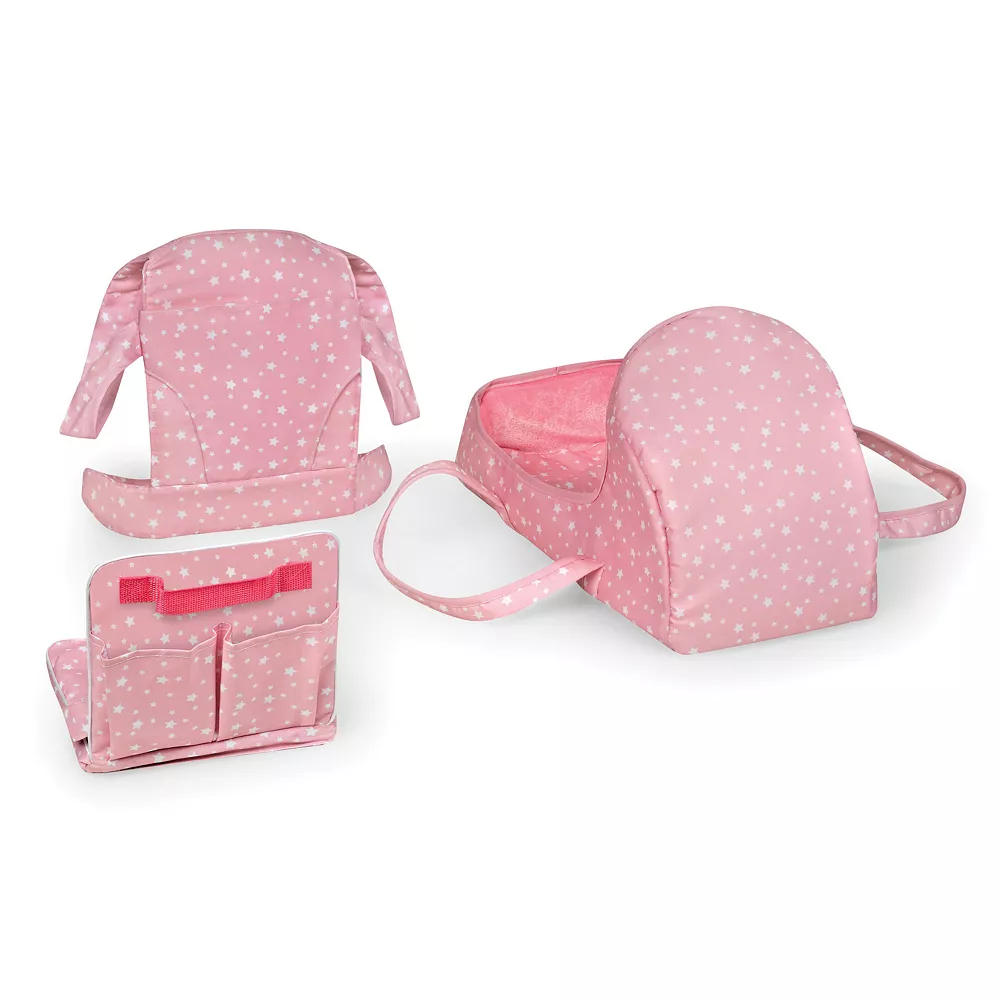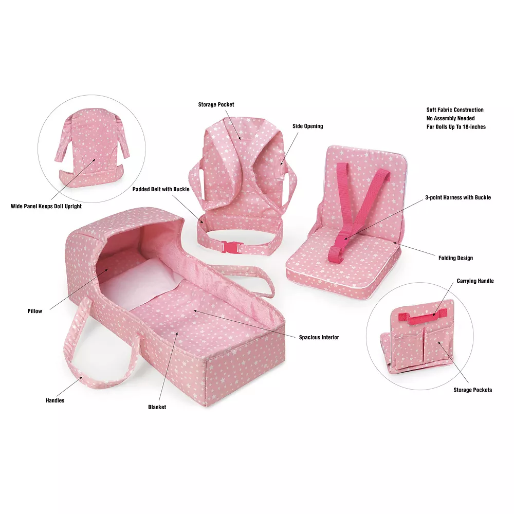 - Five-piece toy set includes doll travel bed, car seat/booster seat, hands-free front pack carrier, reversible blanket, and fluffy pillow