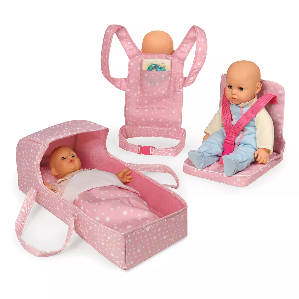 - 5-piece toy set includes doll travel bed with handles, car seat, hands-free front pack carrier, reversible blanket, and fluffy pillow