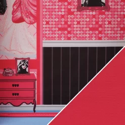 - Thoughtfully covered in full color fabric inside and out bursting with glamorous home and fashion details to encourage imaginative play. Your doll can check her hair in the shiny mirror, and take a pretend shower behind the sheer bathroom curtain