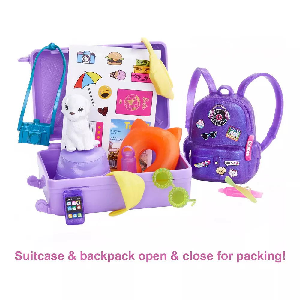 - Includes 1 doll and travel accessories that include a puppy, large rolling suitcase, backpack, camera, neck rest, sunglasses and more