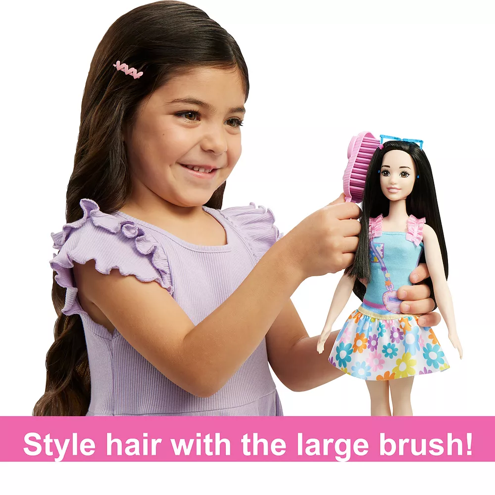 - Renee doll has straight black hair. Kids can use the included large-scale brush to comb and style her hair, which can help build dexterity and help teach about personal care!