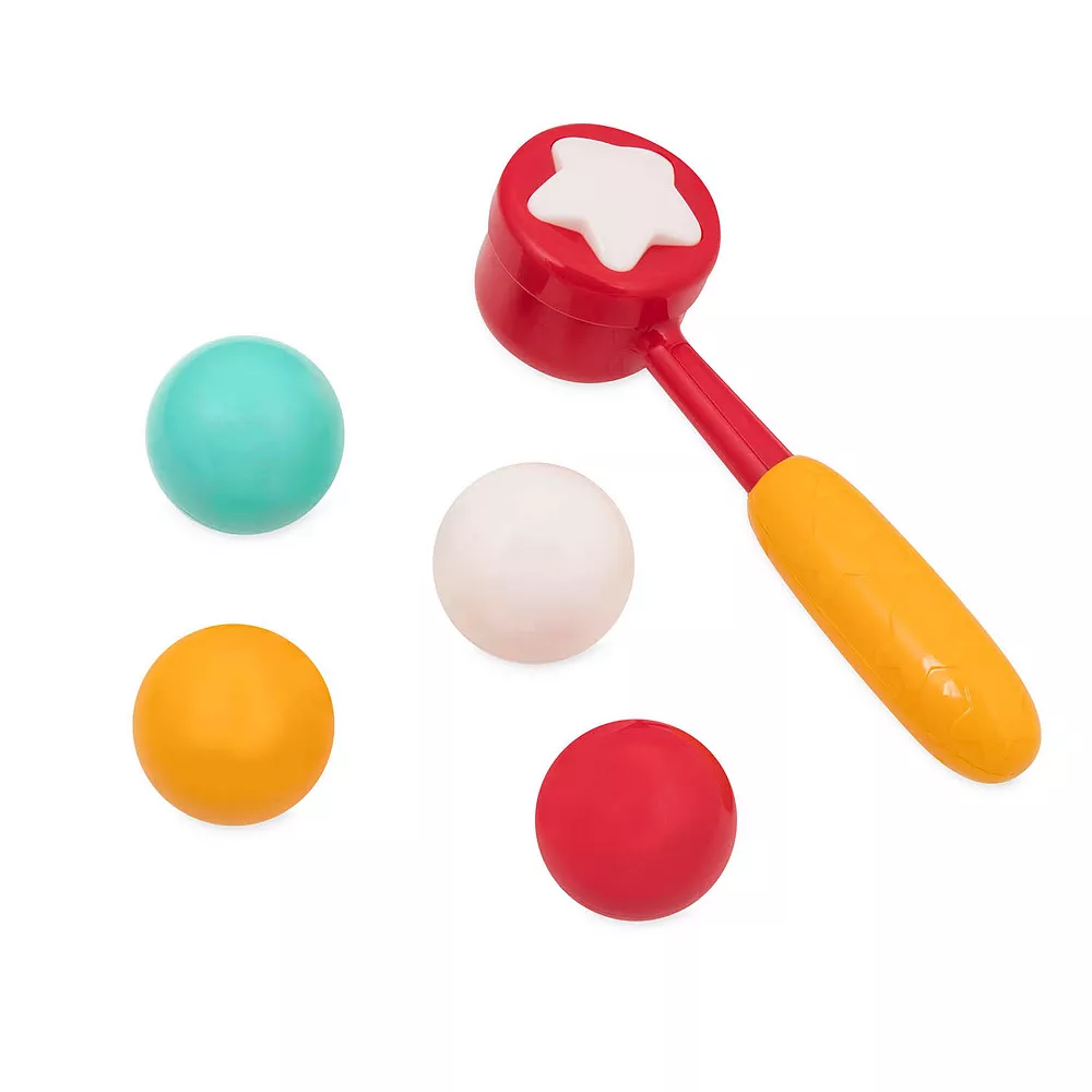 - Place the balls in their color-coded openings, grab the hammer and WHACK! See the little red star spin as the balls roll their way down!