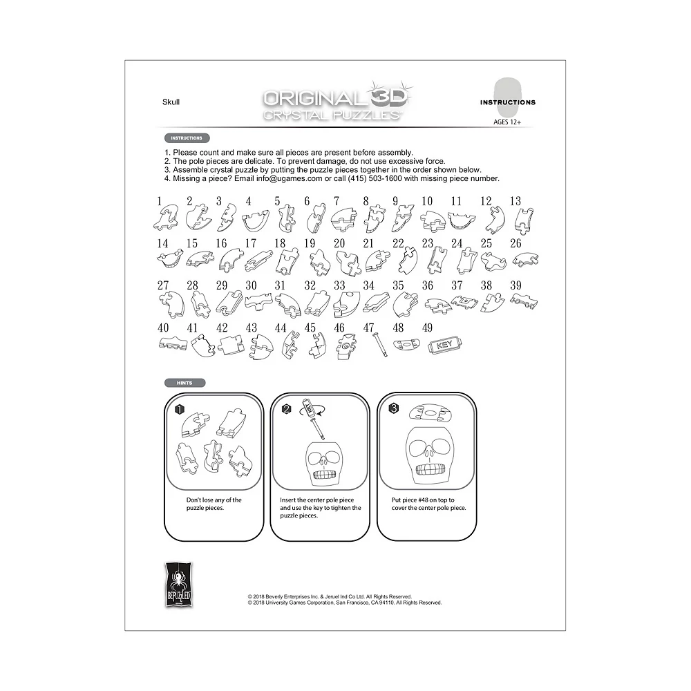 - Challenging to Complete, Beautiful to Display: The Skull Original 3D Crystal Puzzle is a beautiful creation to add to your puzzle collection. This three-dimensional brainteaser jigsaw puzzle is enjoyable to work on, challenging to complete, and beautiful to display. This puzzle is designed for ages 12 and up