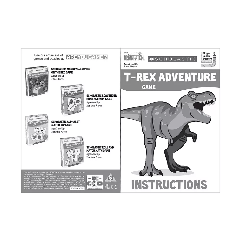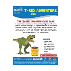 - 1 Game Board, 4 Red Dinosaurs, 4 Blue Dinosaurs, 4 Yellow Dinosaurs, 4 Green Dinosaurs, 1 T-Rex Dinosaur, 3 Dice, Instructions