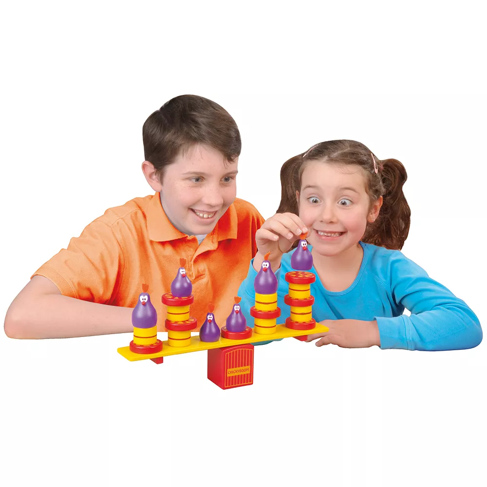 Remove the chickens, hay bales and wagon wheels to score the most points without toppling the perch in this Chickyboom Game by University Games.