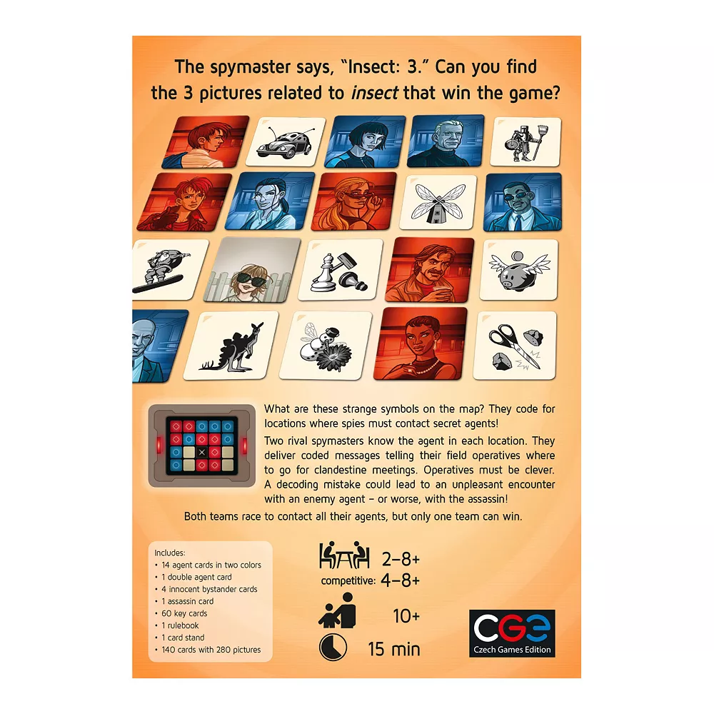 - Includes 14 agent cards in 2 colors, 1 double-agent card, 4 innocent bystander cards, 1 assassin card, 60 key cards, rulebook, card stand, 140 cards with 280 pictures