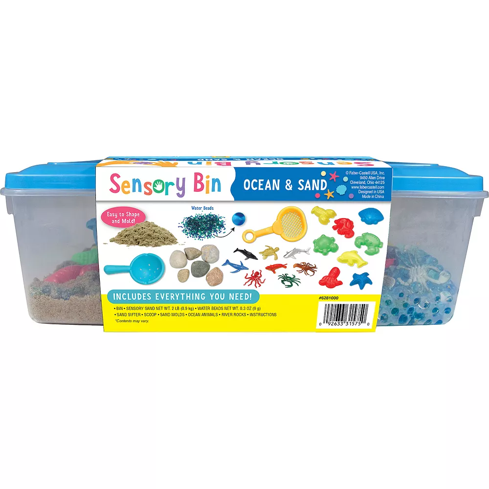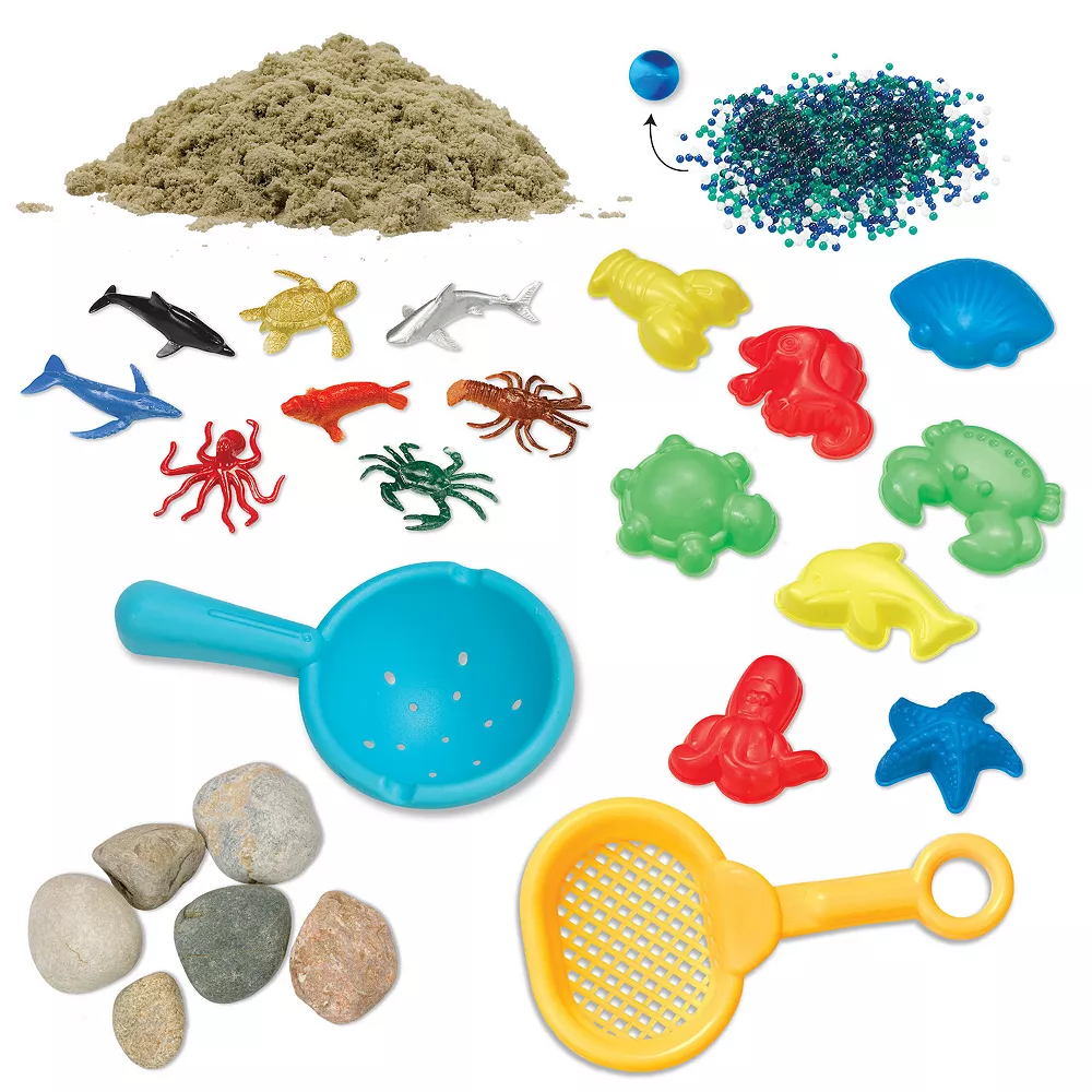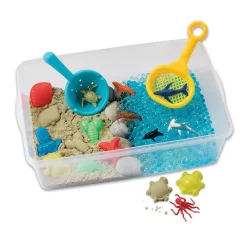 - 2 lbs of soft sensory sand, water beads, ocean animal toys and a variety of sensory tools all conveniently packed in a bin with lid for easy storage