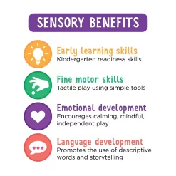 - No glue needed! Designed with little fingers in mind, simply fill in the 13x 13″ sticky picture with the colorful sensory craft materials included