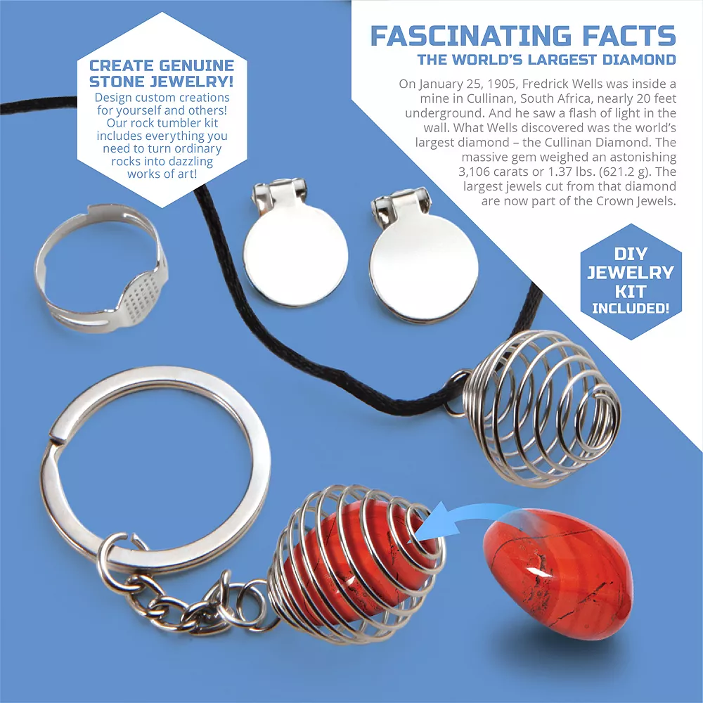 - Includes motorized rock tumbler, stones, jewelry accessories and more