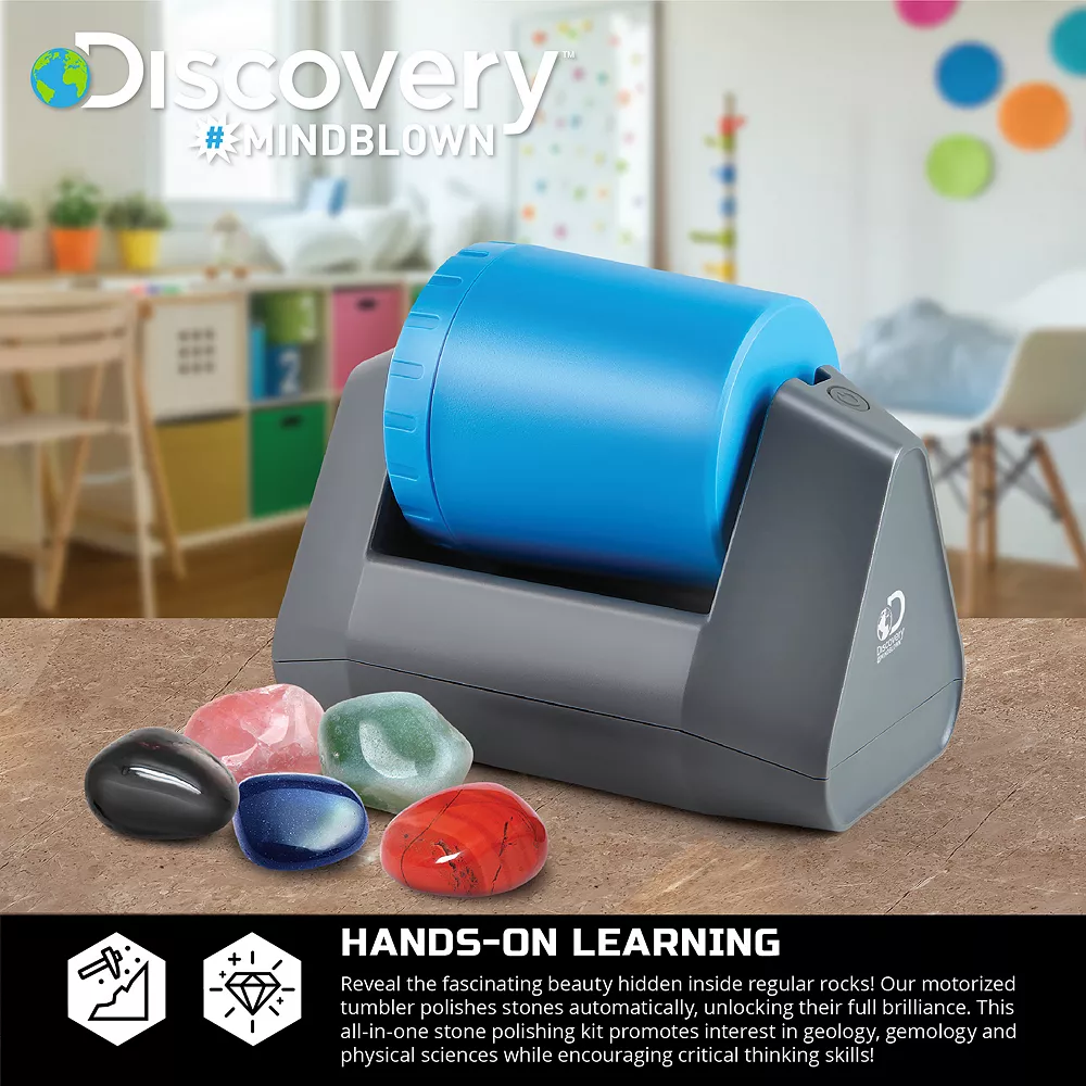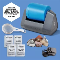 Beautiful gemstones are polished, smoothed and shaped by their existence in nature and being tumbled through rivers-a process that usually takes thousands of years! Now you can mimic that same natural event with the Discovery #MINDBLOWN Rock Tumbler Kit. The tumbling motion, gritty sand and water are the only things Mother Nature uses to polish natural quartz and other stones. This kit takes those things and adds electrical power so speed up that natural process. Just add the stones, rocks, and the gritty sand to the tumbler and let it do all the work for you. Within days you will have smooth and polished gemstones that you can use for making accessories. Children ages 10 and up will enjoy being a scientist with this kit! This set from Discovery #MINDBLOWN uses natural science and geology concepts to bring you a fun and educational toy!