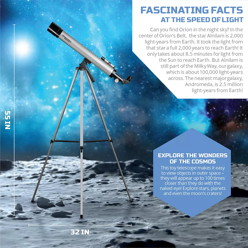 - EVERYTHING YOU NEED TO OBSERVE THE GALAXY: The full set includes the telescope with 50X and 100X lenses, 2 lens canasters, 1 3X finder scope, 1 adjustable tripod, and 1 telescope lens cap!