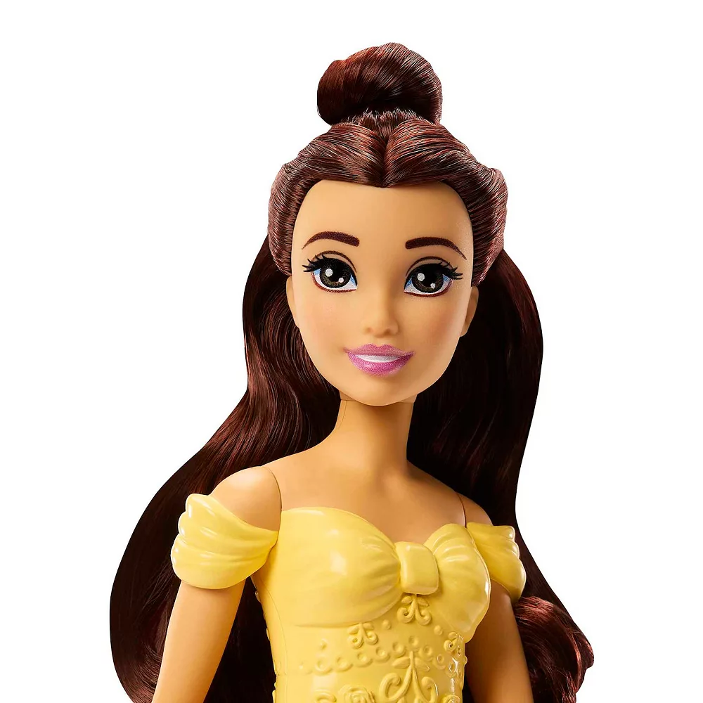 - Posable Belle doll wears a floral fashion in her signature color, featuring a shiny removable skirt and shoes