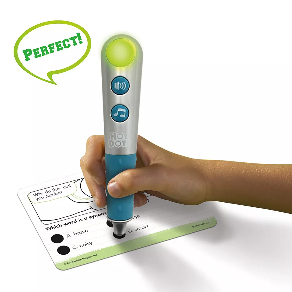 - Works with dozens of Hot Dots and Hot Dots Jr. books, activities, and card sets – just press to an answer dot for an immediate audio visual response.