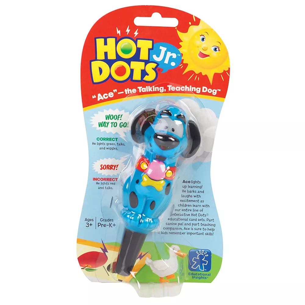This Educational Insights Ace the talking and teaching dog pen gives immediate and encouraging responses to your little one when they press the pen to an answer on any Hot Dots Jr. Card.