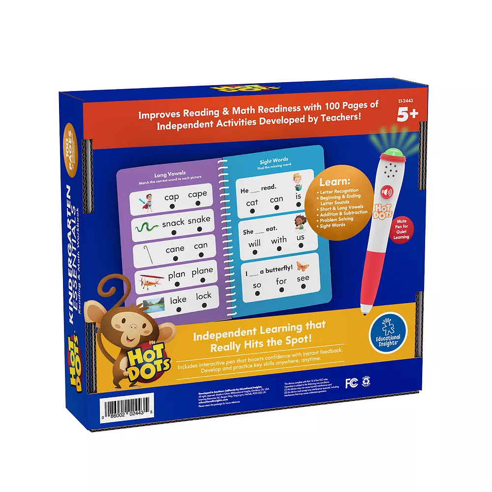 Independent learning really hits the spot with this Hot Dots Kindergarten Reading and Math set! It helps get your child ready for kindergarten with interactive, electronic Hot Dots pen with light and sounds effects and 100 pages of standards-based, foundational preschool reading and math activities.