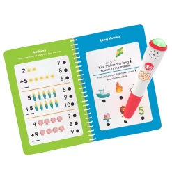 - Includes two spiral-bound activity books, each featuring 50 pages of standards-based, foundational Kindergarten reading and math activities including letter and vowel sounds, addition, subtraction, and more; and electronic Hot Dots pen with lights, sound effects, and mute button