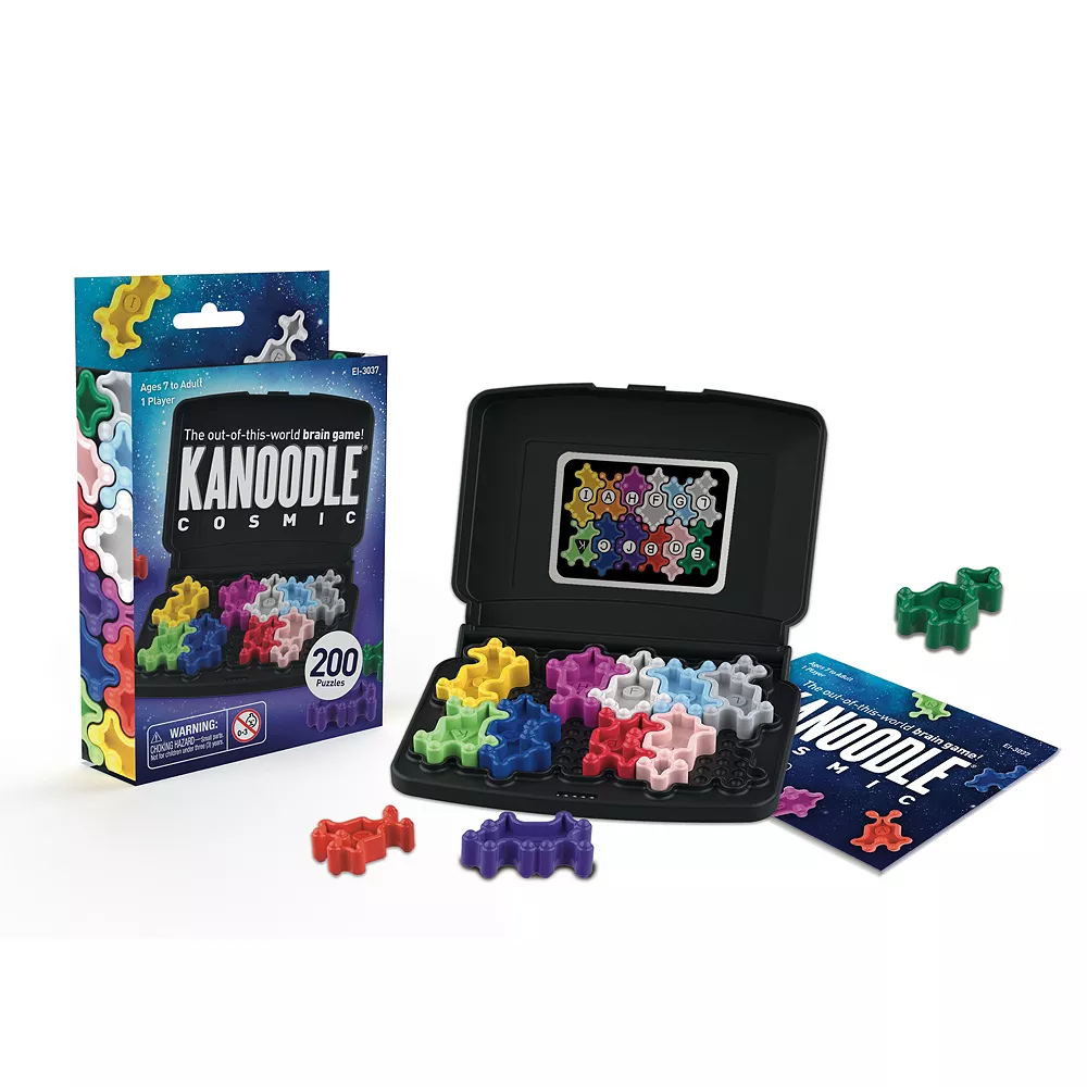 - 2-D BRAIN-TWISTING PUZZLES: Kanoodle Cosmic is a puzzle game that includes 12 puzzle pieces, 200 puzzle challenges, a puzzle book, and a carrying case. This tricky brain teaser is perfectly portable for solo play on the go!
