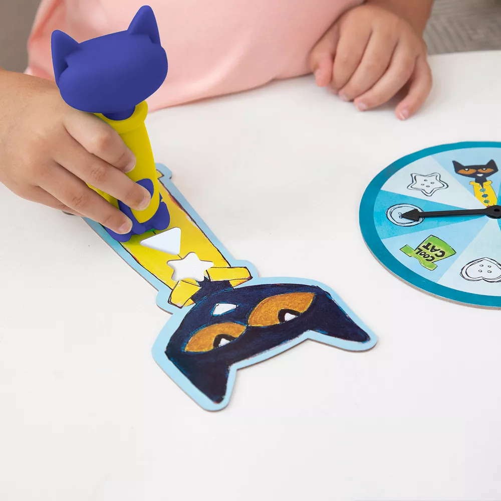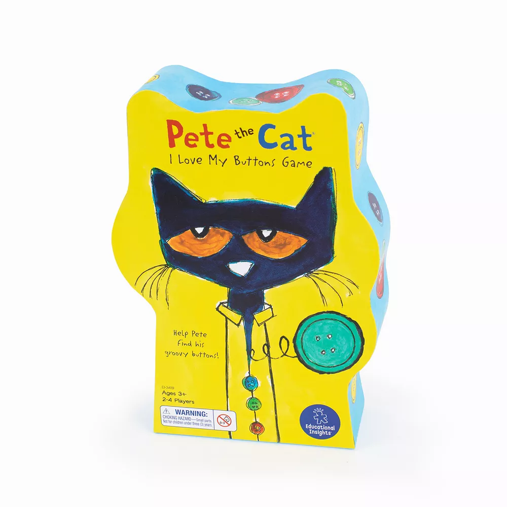 - Includes 4 Pete the Cat shirt boards with shaped button slots, 20 shaped buttons, 1 Pete the Cat squeezer, game spinner, and guide