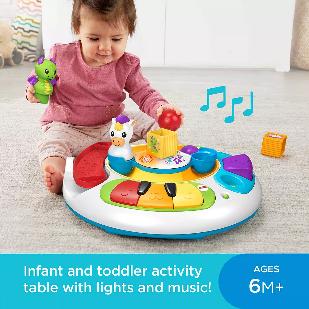 - Interactive, musical activity table with spinning action, 2 balls, 2 blocks, and friendly unicorn and dragon characters
