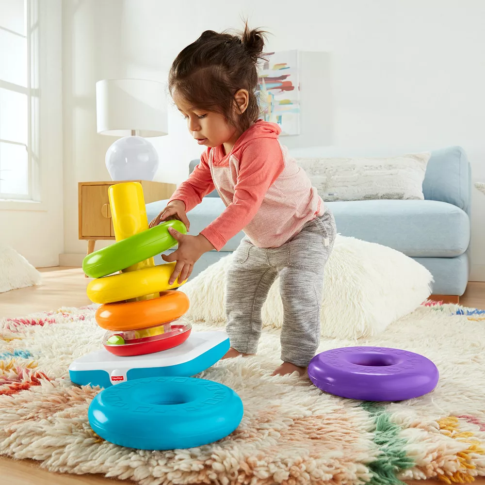 At over 14 inches tall, the Fisher-Price Giant Rock-a-Stack takes classic stacking play to new heights. Your baby can grasp and shake the six extra-large, colorful rings, then stack ’em up high on the wibbly-wobbly, super-sized base. And the littlest ring has swirling beads inside for your tot to shake and explore!