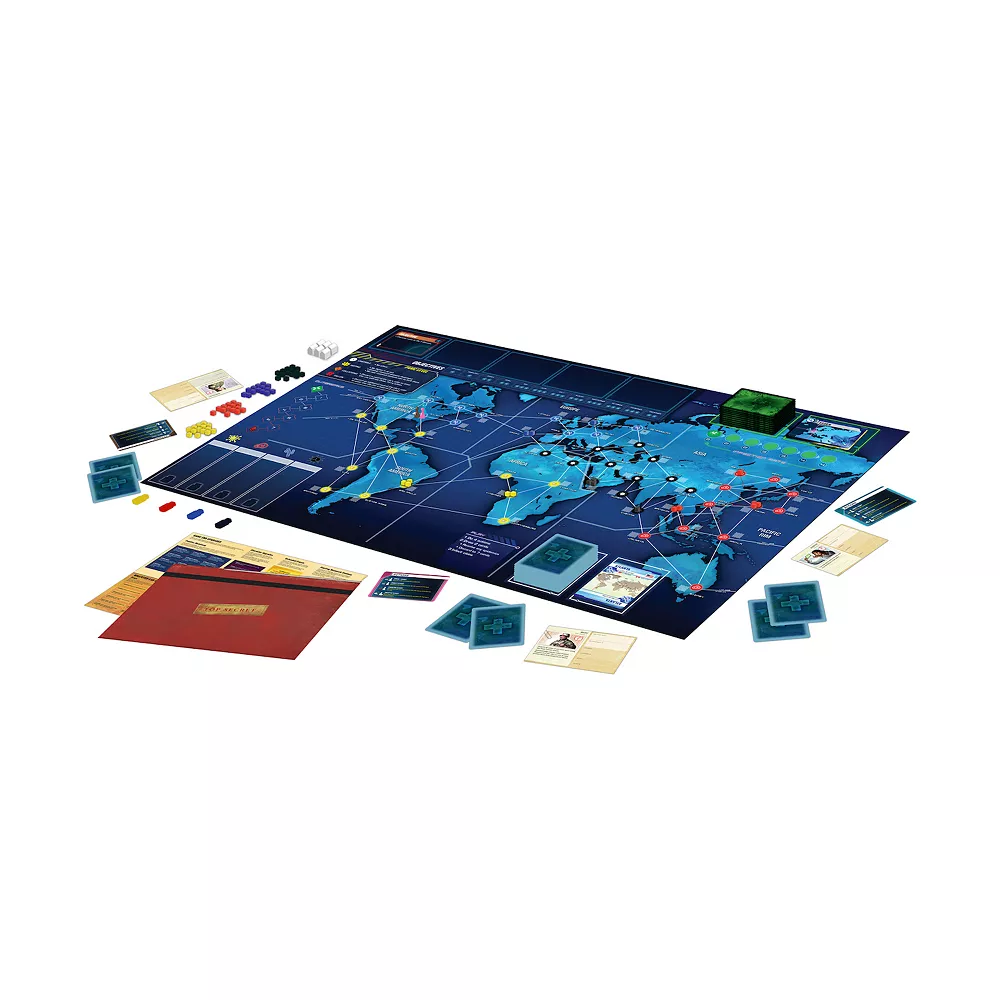 - Game Board, 5 Character Cards, 4 Pawns, 6 Research Stations, 7 Markers, 96 Disease Cubes, 48 Infection Cards, 61 Player Cards, 62 Legacy Cards, 4 Civilian Cards, 5 Dossiers, Reference Cards, 1 Package Box with 8 Numbered Packages, Rulebook, 1 Sticker Sheet