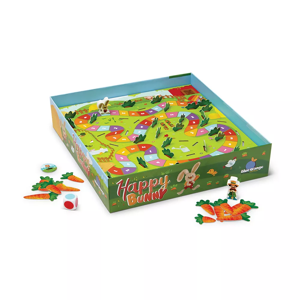 - 1 Playing Field, 40 Carrots (12 Small, 10 Medium, 18 Large), 1 Wooden Farmer Token, 1 Wooden Bunny Token, 1 Bunny House, 1 Colored Die, Illustrated Rules