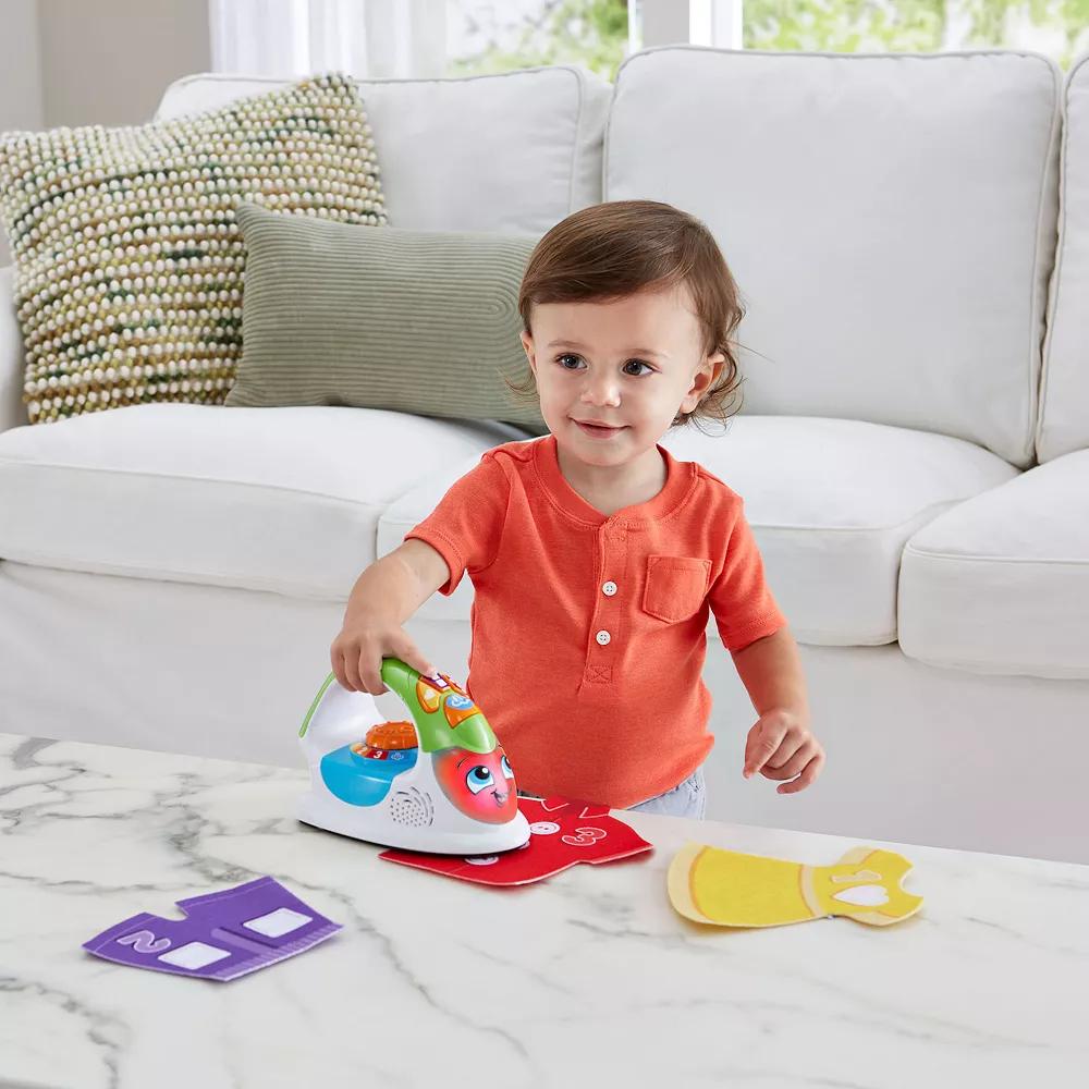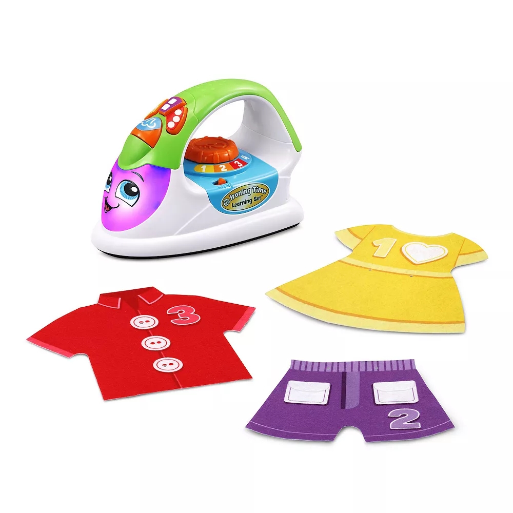 Press into learning about shapes, colors and counting with the motion-activated Ironing Time Learning Set! This interactive iron plays songs, silly phrases and sound effects when kids move the iron back and forth.