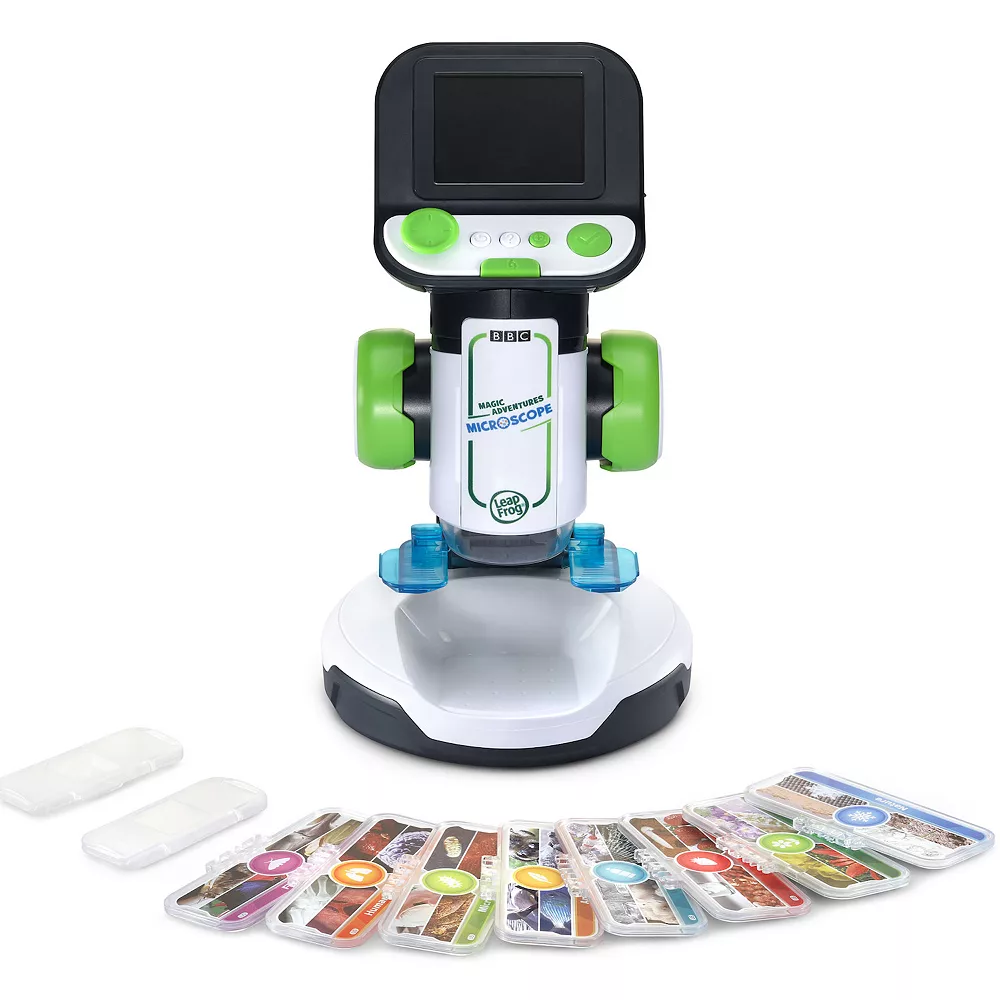 - LeapFrog® Magic Adventures Microscope™ and Eight double-sided smart slides show custom, educational BBC videos and images on the 2.4″ viewing screen