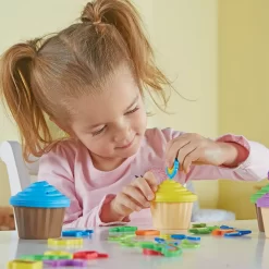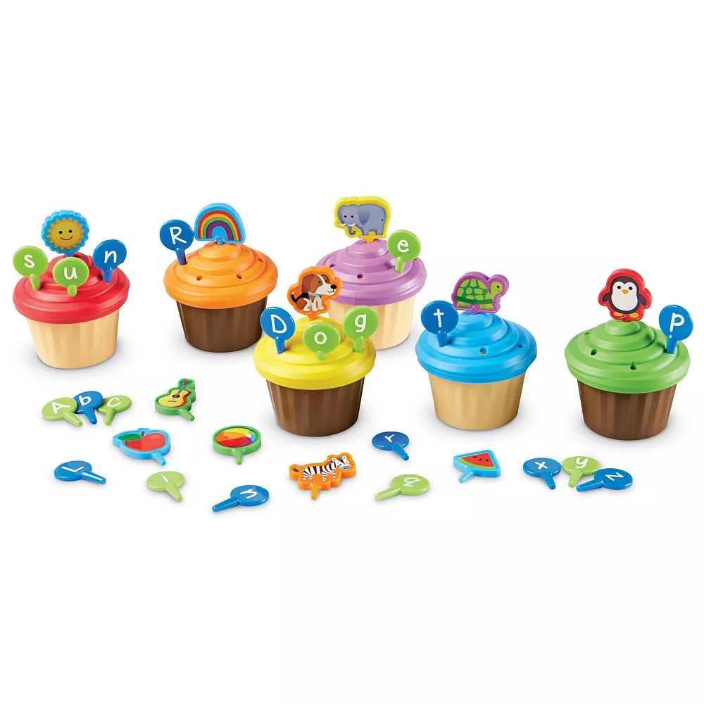 Turn learning the ABCs into a treat-filled party! Kids learn alphabet and early language skills at every tea party with the ABC Party Cupcake Toppers from Learning Resources. This set’s six pretend cupcakes come ready to decorate with 56 letter and picture toppers that help kids work on learning the alphabet, mastering beginning sounds, building vocabulary skills, and more. ABC Party Cupcake Toppers support open-ended play – match the toppers to their starting letters, explore the difference between upper and lowercase letters, or consult the online word list for a guide to spelling simple two- and three-letter words! Toppers double as fun cupcake decorations, and add imaginative treat games of pretend or tea parties for imaginary friends! When playtime ends, the toy cupcakes reveal their neatest trick yet: all 56 toppers store inside the 6 cupcake bases, turning cleanup from a chore to a delight.