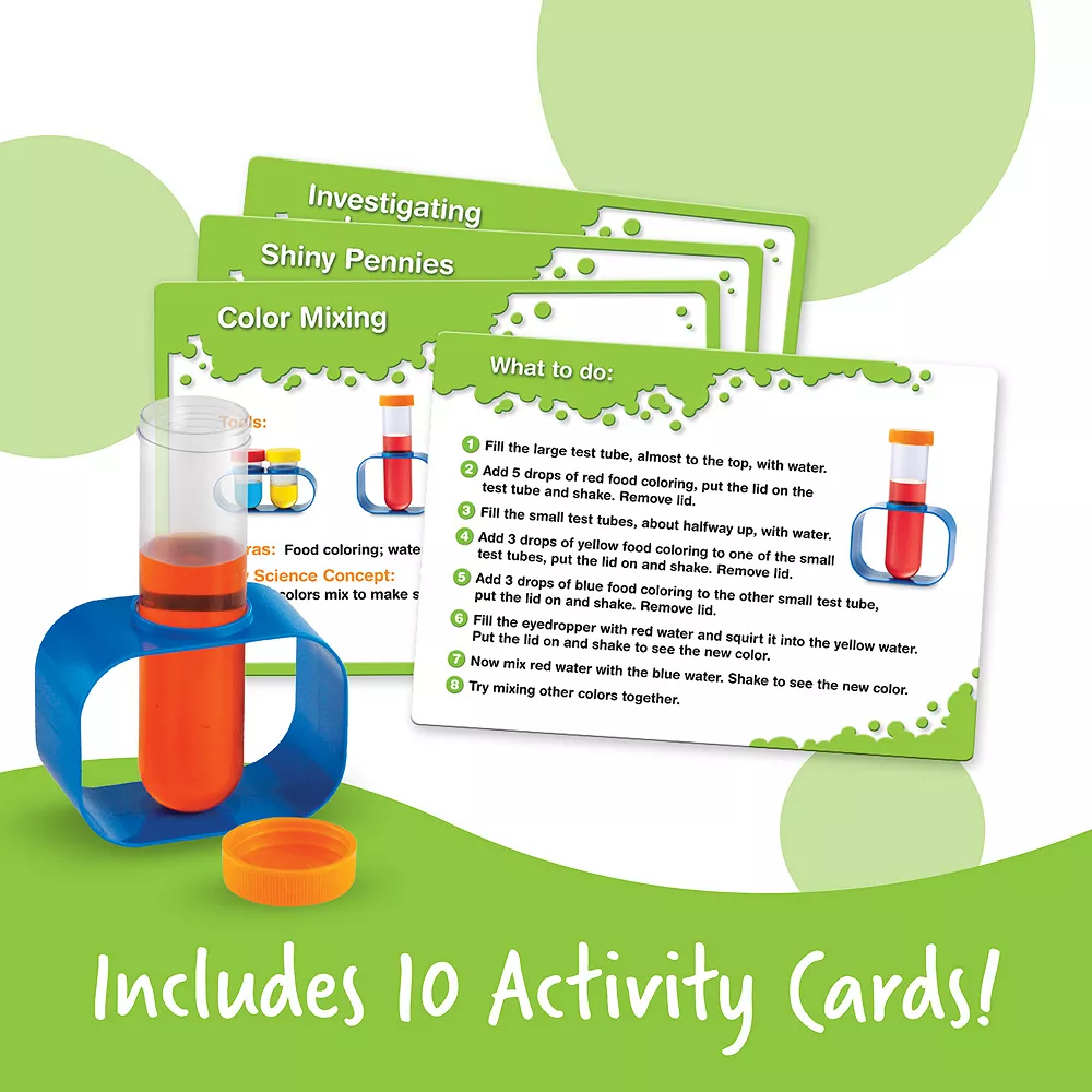 - 22-pieces include: beaker, magnifying glass, funnel, test tubes and an activity guide and cards with fun, easy-to-do experiments