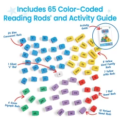 - Color-coded rods include consonants, vowels, digraphs, vowel teams, word families, and affixes
