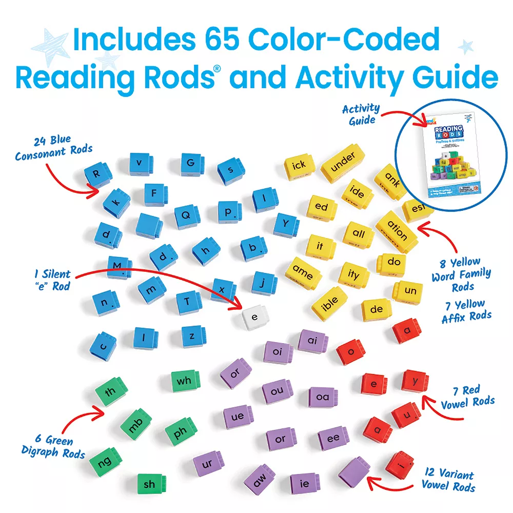 Take the challenge out of learning to read. This Reading Rods Prefixes & Suffixes Activity Set helps children learn to use affixes, roots, and bases to decode complex words.
