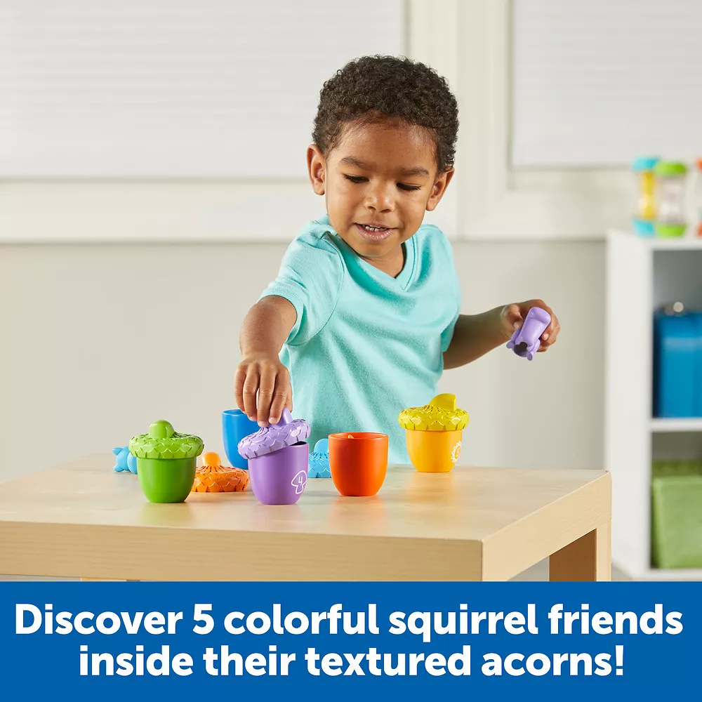 - Toddlers build new hand strength, coordination, and other fine motor skills when they discover the squirrel surprises hidden in this toddler learning toy’s two-piece textured acorns