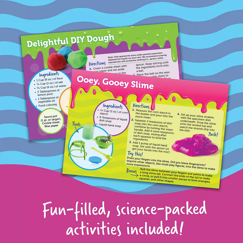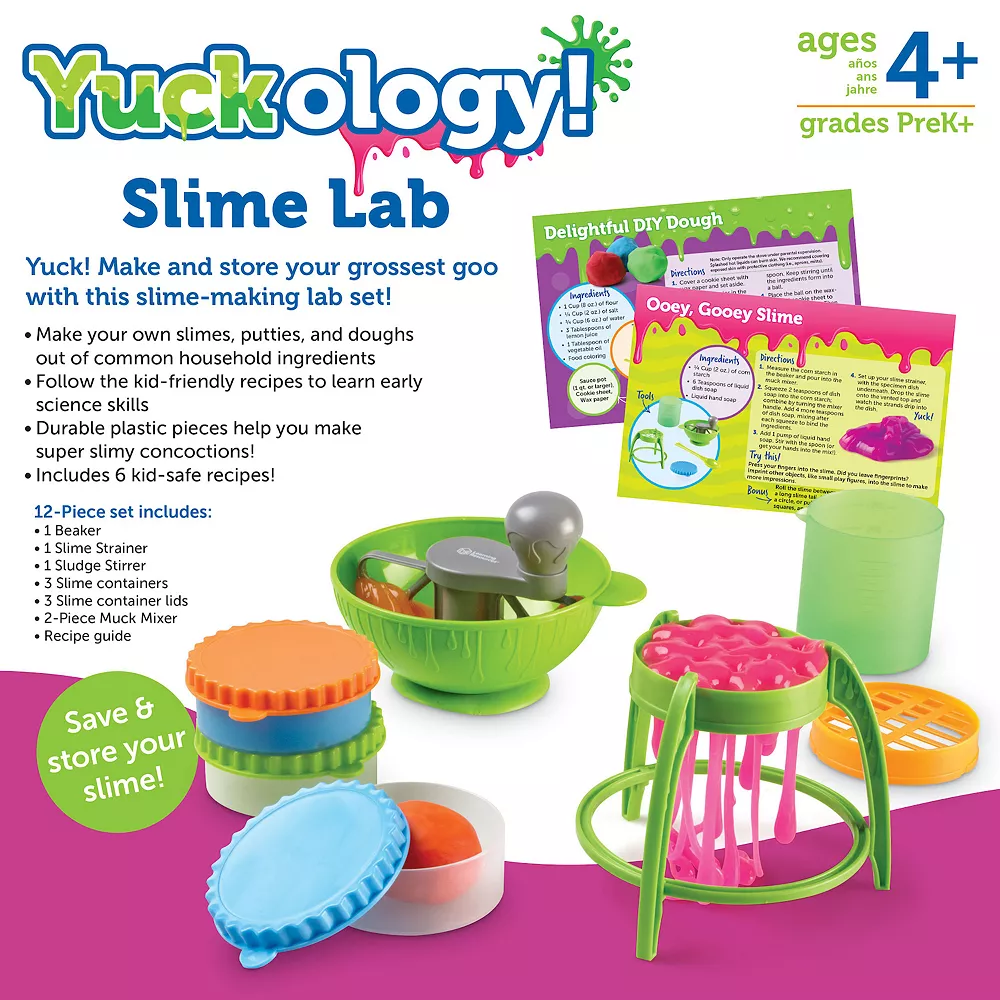 Yuck! Make and store your grossest goo with the Yuckology! Slime Lab from Learning Resources. Using common ingredients found around the house, kids build their early science skills as they mix, stir, and stretch their own magic slime, dough, and putty creations. As they follow along with six easy kids’ experiments found within the Yuckology! Slime Lab’s full-color guide, kids also learn the science behind the goop, as well as STEM skills in color mixing, measurement, and more. Yuckology! Slime Lab’s durable plastic pieces are sturdy enough to make and manipulate play slime again and again – squish and smoosh with the Muck Mixer, twist and twirl with the Sludge Stirrer, or test your stretchy slime with the Slime Strainer! This slime maker set even comes with storage dishes that let kids store their best slime, putty, and dough for future gross-out sessions. Each of Yuckology! Slime Lab’s pieces also wash clean for easy storage, so they’ll always be ready for a goopy good time!