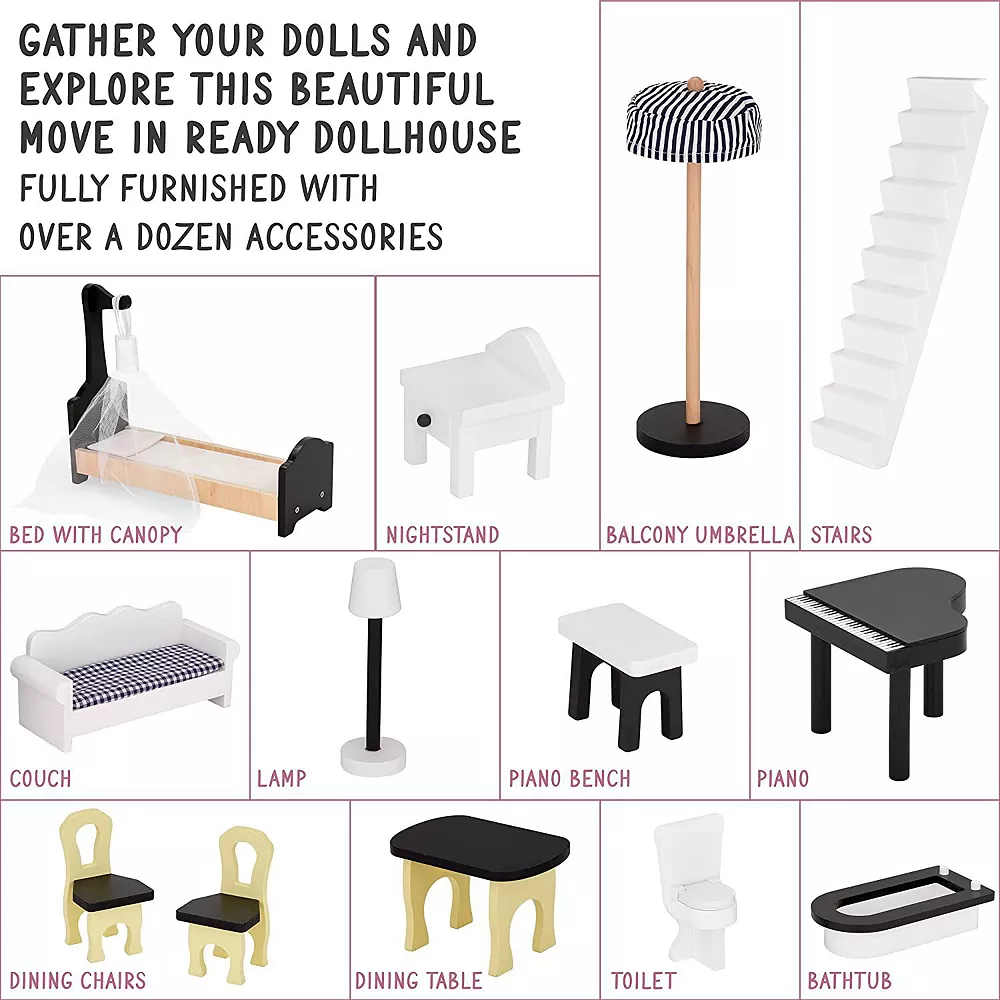 - Fully furnished Dollhouse comes with several pieces of furniture like a lamp, couch, bed, and more