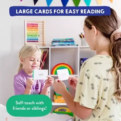- HIGH QUALITY. Large cards are big enough for little hands to comfortably hold on their own. And feature bold, easy to read letters for kids and caregivers. Expertly designed with a single “bookmark” corner for effortless sorting. And answers written on the back so there’s no need to constantly flip.