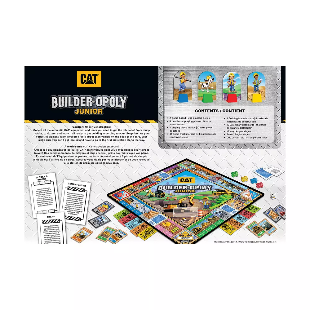 Explore the exciting world of construction equipment with CAT Builder Opoly Junior! Collect all the authentic CAT equipment and tools you need to get the job done! From dump trucks, to dozers, and more… all ready to get building according to your blueprints.