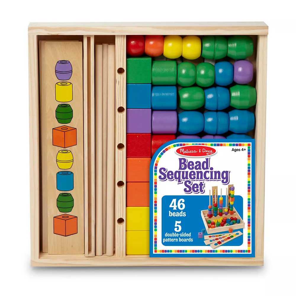 Stack the colorful beads on the dowels to match the pattern cards in this Melissa & Doug sequencing set.