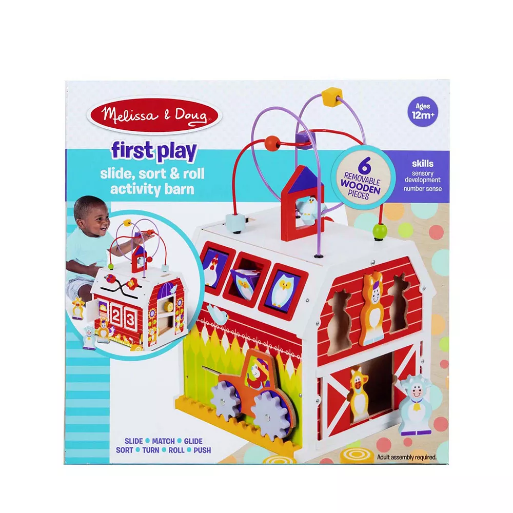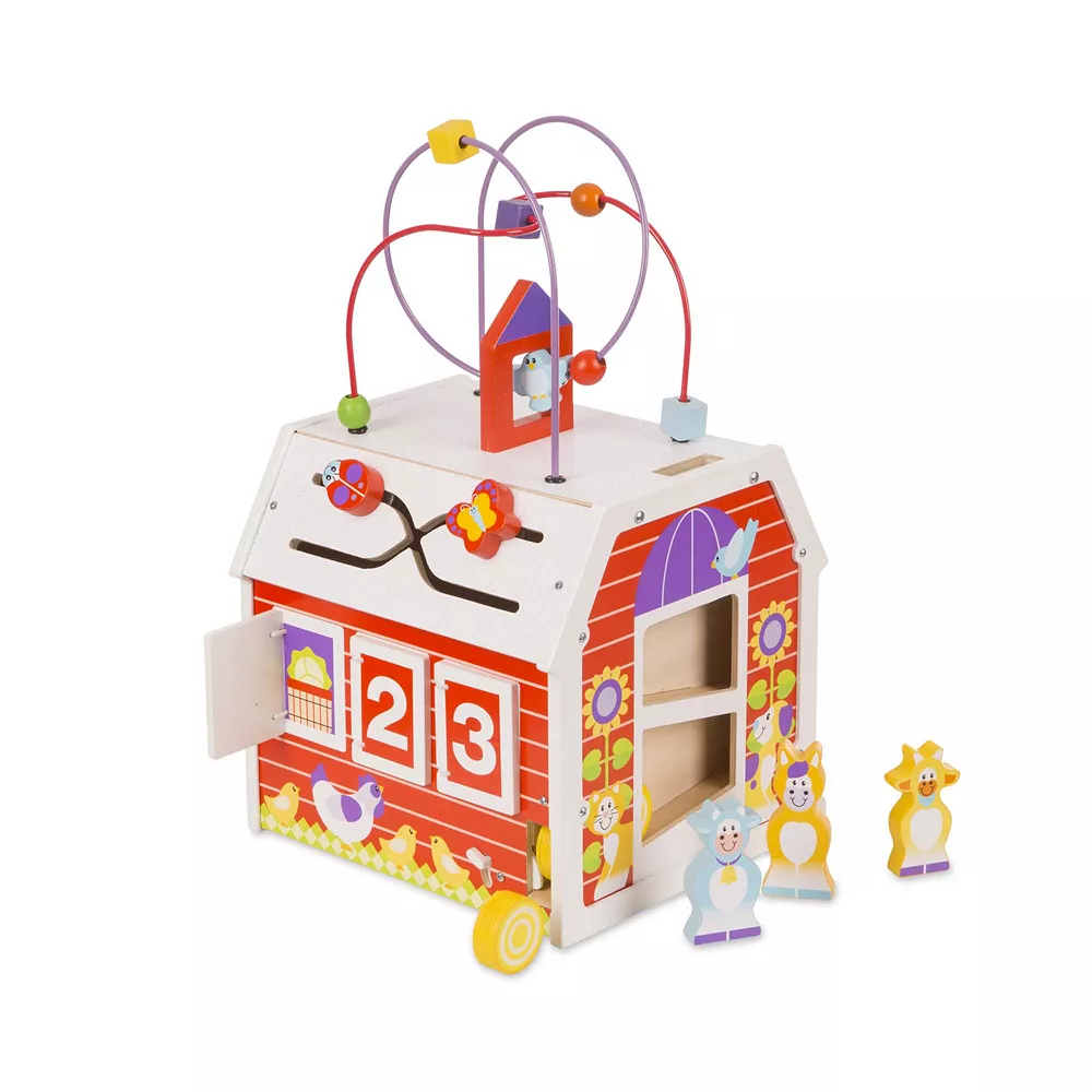 - Sturdy wooden farm-themed activity barn with both attached and removable pieces to slide, sort, and roll