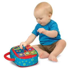 This Melissa & Doug Take-Along Shape Sorter lets kids lift crinkly flaps, identify pictures and match shapes.