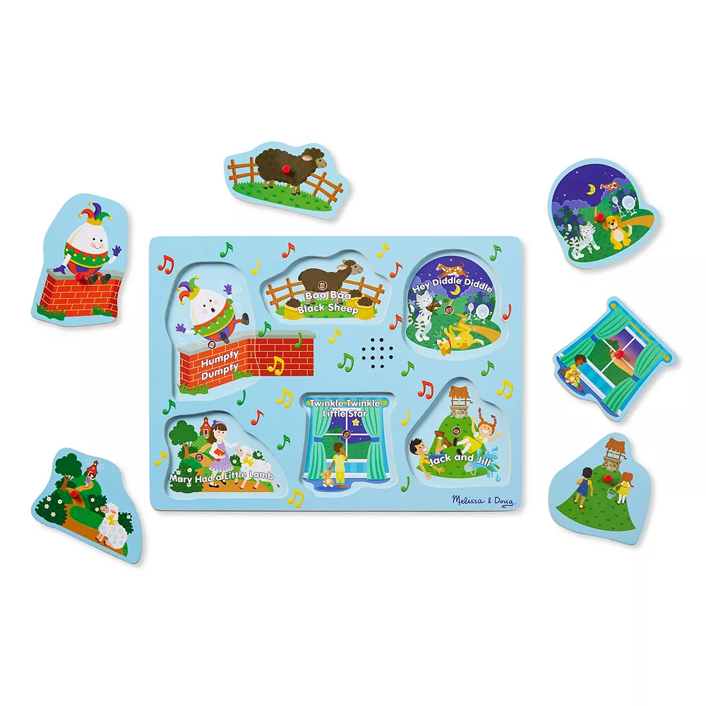 Sing along with favorite childhood characters and nursery rhymes with this unique wooden peg song puzzle from Melissa & Doug!