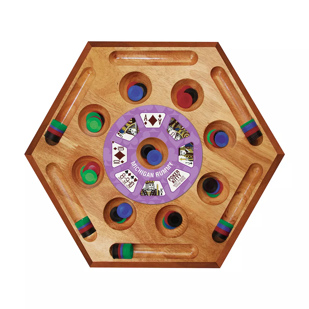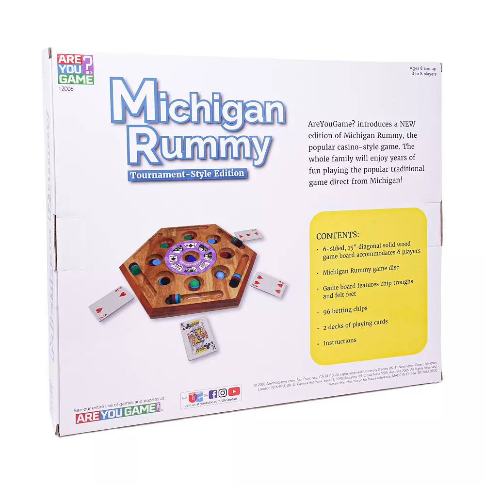 AreYouGame introduces a new edition of Michigan Rummy, the popular casino-style game. This unique card game combines the best elements of the game rummy, with the excitement of chip betting. Featuring a 6-sided, 15-inch diagonal stained wood game board with beveled edges and casino-style betting chip troughs, this handsome set makes a great gift for the whole family and a lovely addition to any coffee table or game room. The whole family will enjoy years of fun playing the popular traditional game direct from Michigan!