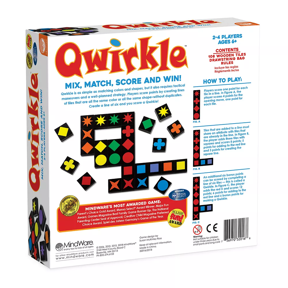 - How to play: Players score points by building rows and columns of brightly-colored tiles that are either all the same color or all the same shape, without creating duplicates; create a line of all six in a row, and you score a “Qwirkle.”