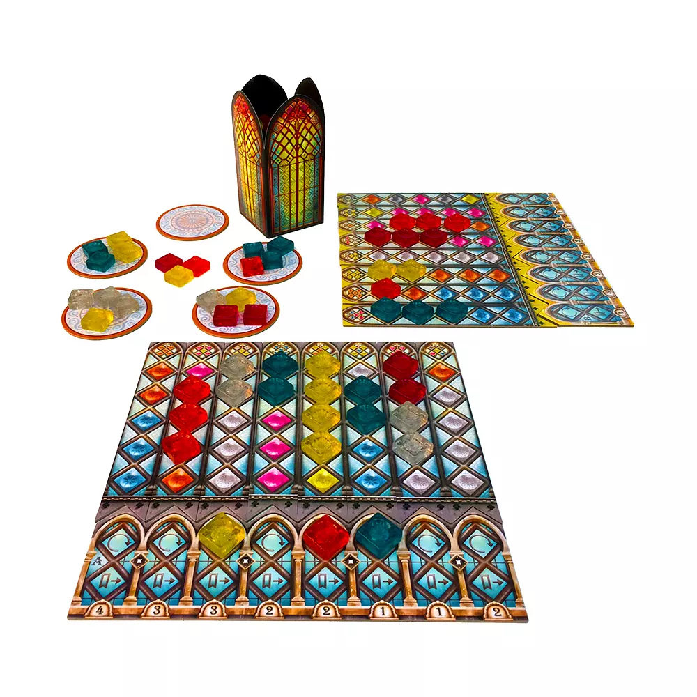 - 9 Factory Displays, 4 Palace Boards, 32 Pattern Strips, 4 Glaziers, 8 Markers, 100 Pane Pieces, 1 Scoring Board, 1 Starting Player Tile, 1 Glass Tower, 1 Bag, 1 Rulebook