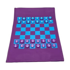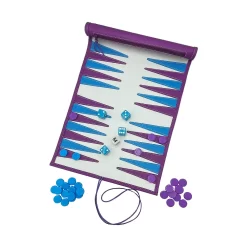 - 1 Double Sided Rollable Checkered/Backgammon Board, 16 Blue Playing Pieces, 16 Purple Playing Pieces, 4 Dice, 1 Doubling Cube, 1 Instruction Booklet