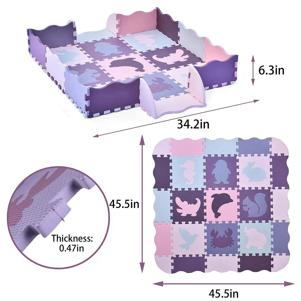 Keep your home looking stylish with this beautiful pastel colored mat. Tummy-time is stylish and interactive, with 25 interlocking foam square tiles with cute animal patterns on it. Your baby can crawl with ease on 100% non-toxic materials, non-skid, waterproof, and stain-resistant foam.