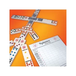 - Wooden Case with Storage Tray, 66 Double-Nine Color-Dot Molded Resin Spinner Dominoes, Colorful Score Pad, Official Spinner Rules
